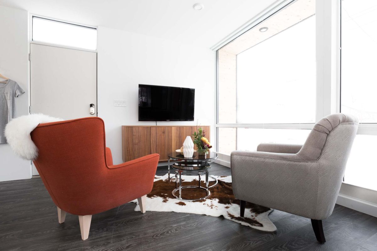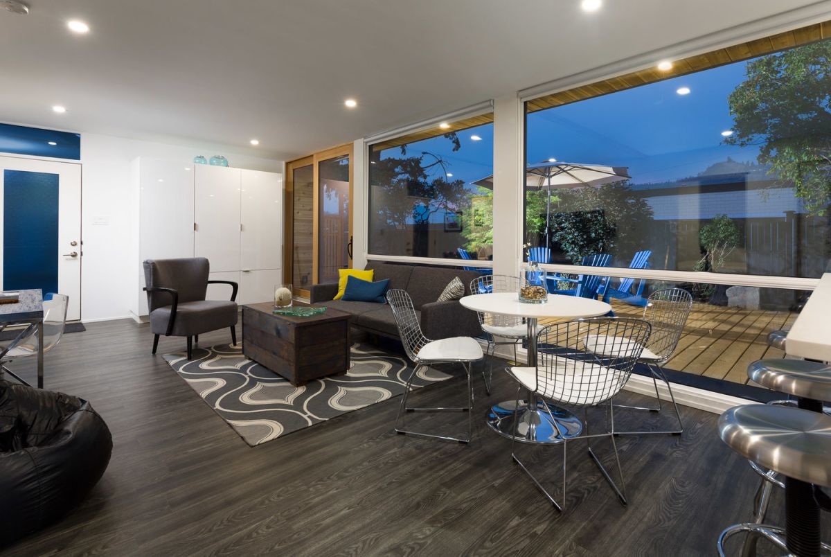 El proceso de fabricación se completa en solo 8 semanas y la instalación lleva un día. El espacio habitable de doble altura es el más impresionante de todos, ya que ofrece una sensación muy aireada y abierta en toda esta casa poco convencional. Grandes ventanales permiten la entrada de luz natural a todos los espacios y al mismo tiempo brindan vistas del entorno. La atención se centra en las vistas y el diseño interior es minimalista y se centra en colores y acabados neutros.