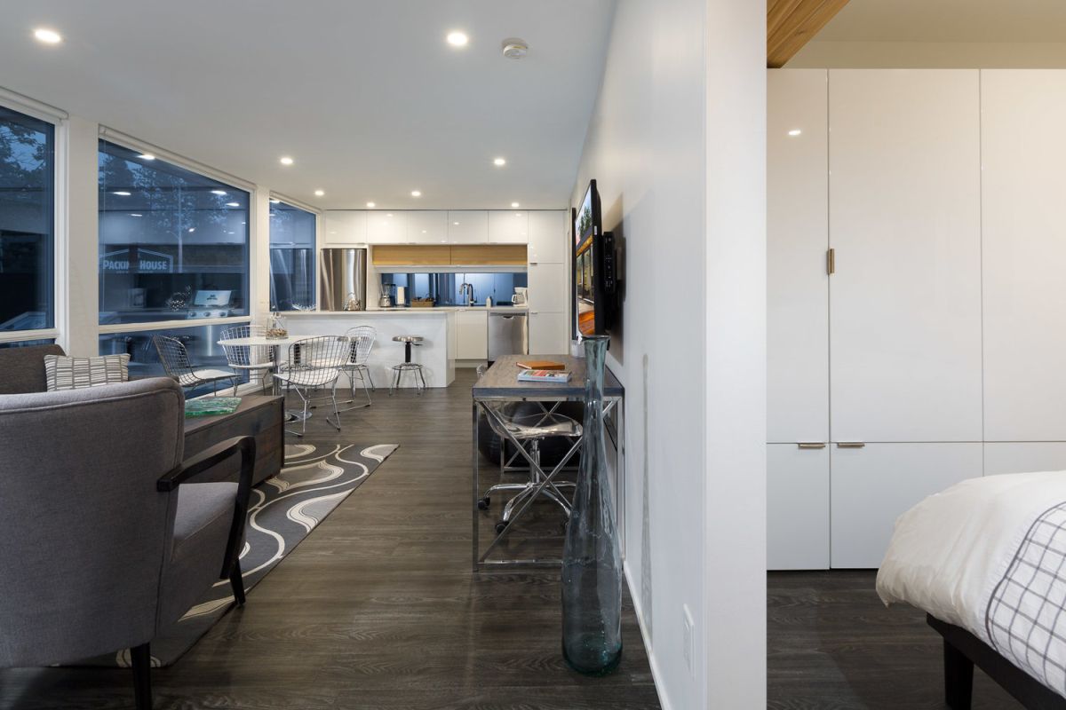Honomobo es una empresa con sede en Alberta, Canadá, que se especializa en la construcción de casas modernas, oficinas, complejos residenciales y más a partir de contenedores de envío. La serie HO incluye casas prefabricadas que varían en tamaño desde un pequeño estudio de 208 pies cuadrados hasta una casa de tres habitaciones que mide 1,216 pies cuadrados. La unidad que ve aquí es la HO2, la segunda más pequeña de la serie. Tiene una sala de estar abierta con una cocina, un rincón para dormir, un espacio de trabajo y un baño.