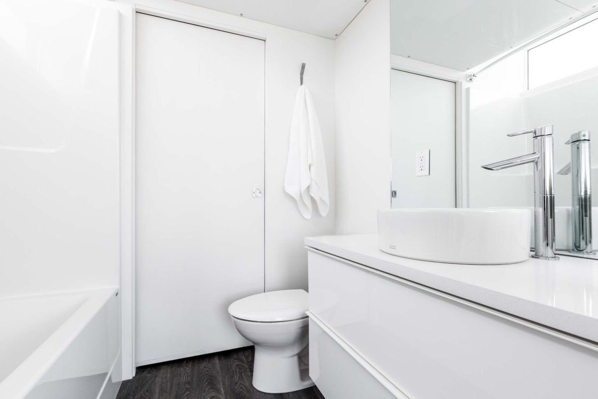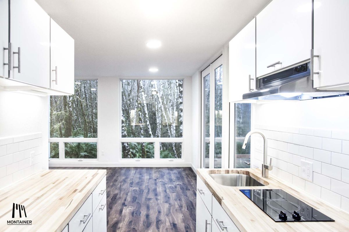Los cubos completamente equipados incluyen todas las características básicas, como paredes aisladas, ventanas de fibra de vidrio de bajo consumo, aislamiento de techo y piso, además de cableado eléctrico, plomería, iluminación, una cocina con fregadero, estufa, refrigerador y gabinetes y un baño completo. ducha de tamaño, un inodoro, lavabo y gabinetes de almacenamiento.