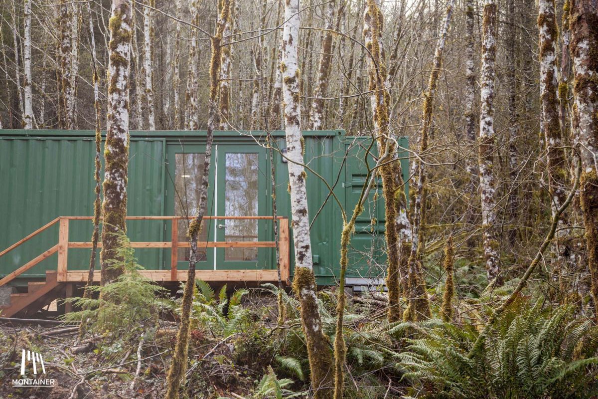 Se hizo a partir de un solo contenedor de envío reciclado que se pintó de negro para mezclarse mejor con el entorno boscoso y encajar más fácilmente en el paisaje.