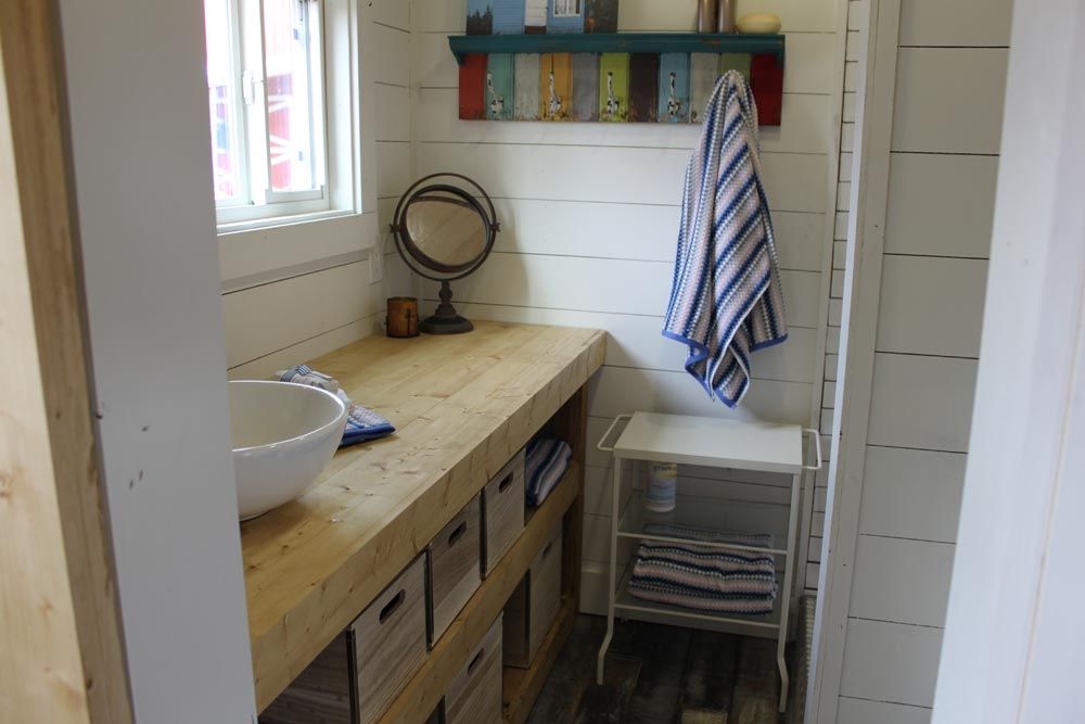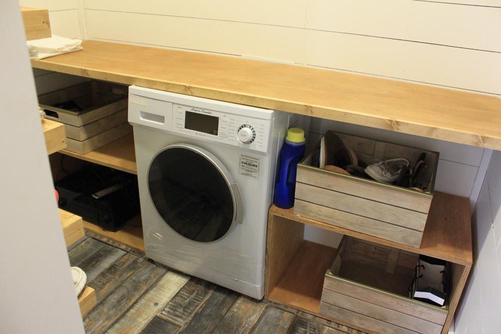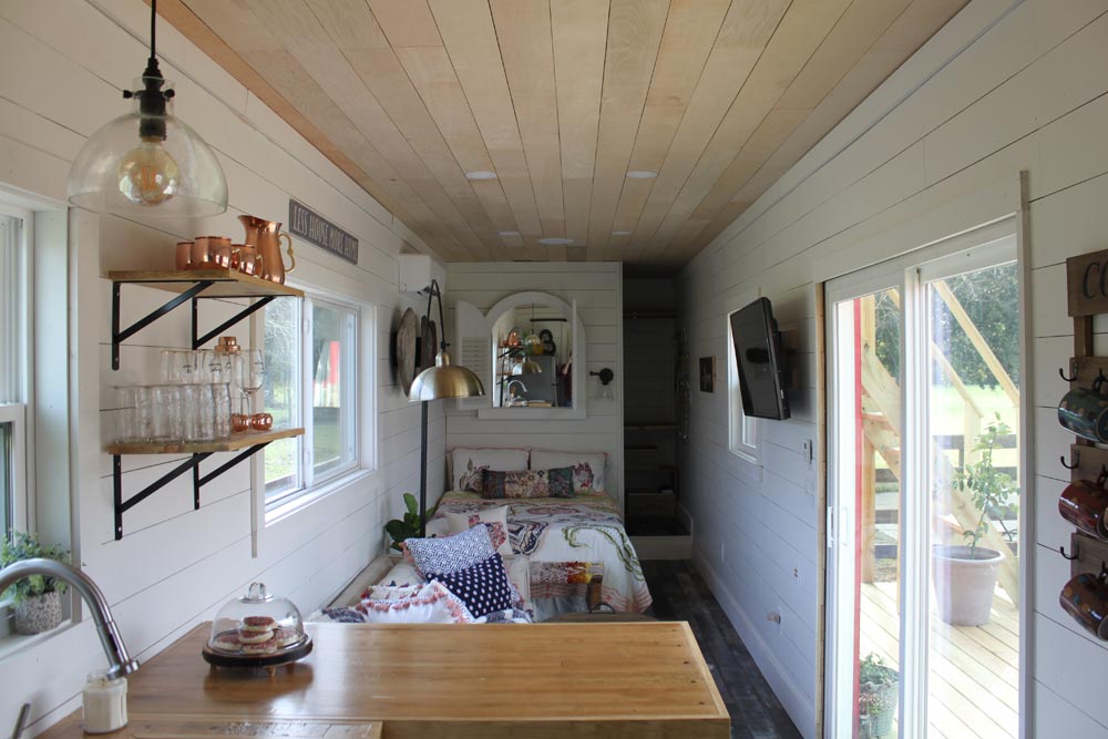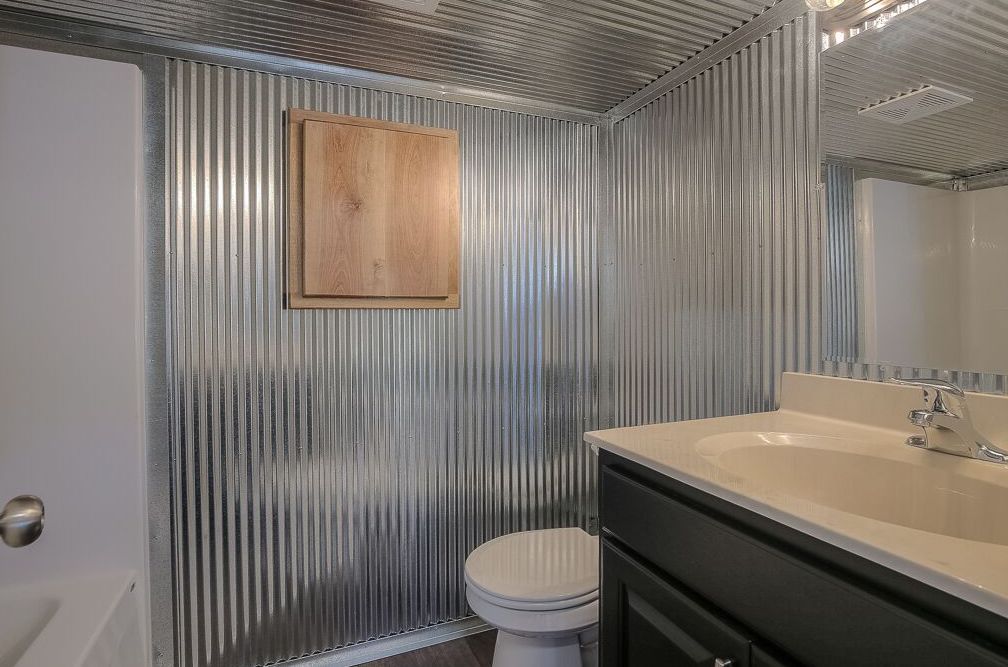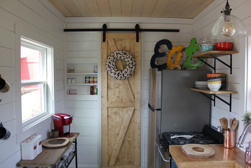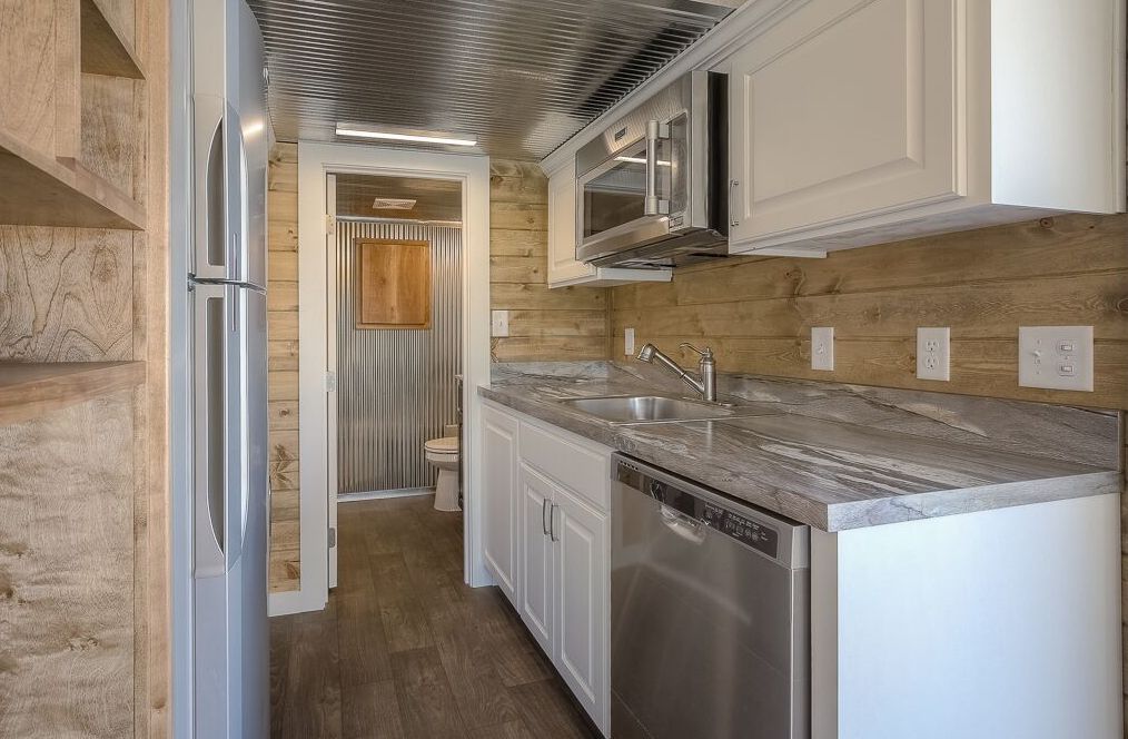 En el interior hay un amplio armario con estantes y espacio para una lavadora, una cocina con desayunador, nevera y un fregadero de estilo rústico y un baño grande con una puerta corrediza de granero. Este diseño es solo una de las opciones. Varios otros están disponibles, incluido uno con dos dormitorios y otro con una sala de almacenamiento para vehículos todo terreno.