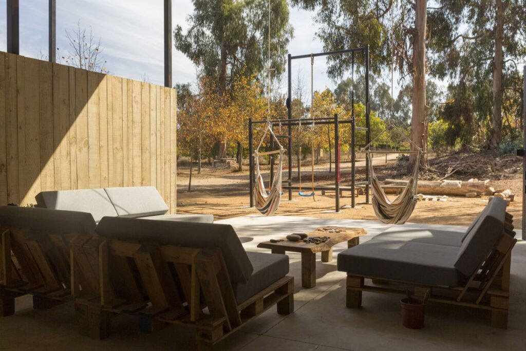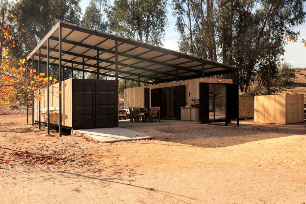 La casa está ubicada en Chile y se construyó a partir de dos contenedores de transporte reutilizados. En lugar de conectar los contenedores y crear un gran espacio, los diseñadores optaron por mantenerlos separados. Se colocaron paralelos entre sí con un gran espacio entre ellos y un techo que se extiende por toda el área. Esto crea dos espacios separados que pueden servir para diferentes propósitos y un área exterior cubierta entre ellos.