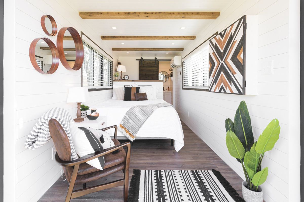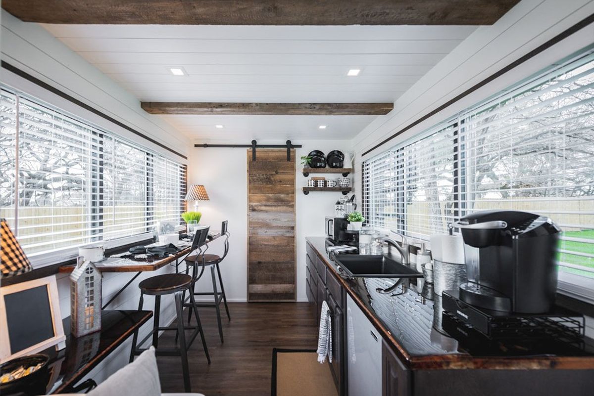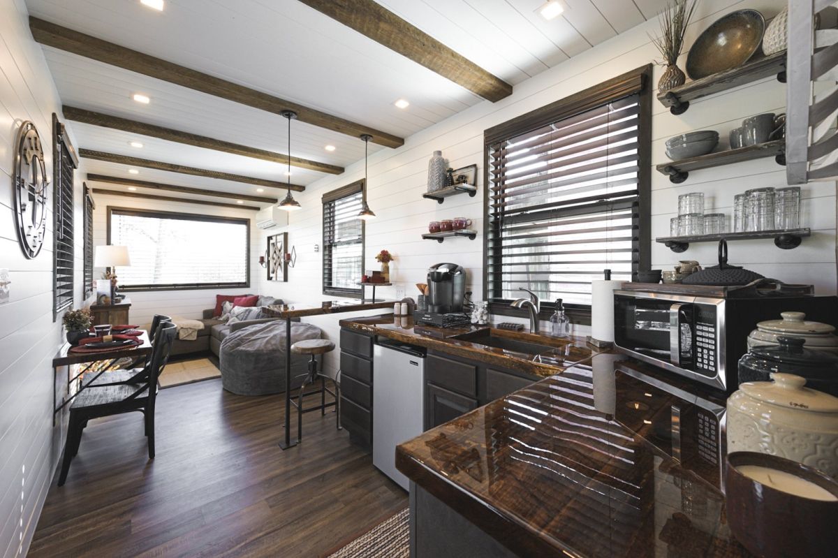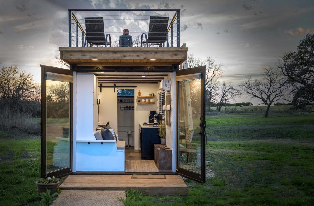 El Anchor es el más pequeño de todos los modelos que ofrece esta empresa. Solo mide 160 pies cuadrados (14,86 metros cuadrados) en total, lo que lo hace realmente compacto. Aun así, todavía tiene suficiente espacio para todas las necesidades e incluso algunas decoraciones encantadoras. Las puertas delanteras están hechas de vidrio y giran 270 grados, dejando entrar la luz natural y enmarcando una vista del exterior. En el interior hay suficiente espacio para una cama tamaño queen que se pliega durante el día y deja espacio para el sofá. También hay un baño y una cocina pequeña pero funcional con encimeras de granito o cuarzo, nevera, fregadero, estufa y almacenaje. Por supuesto, también está la terraza en la azotea con pasamanos y luces LED decorativas.