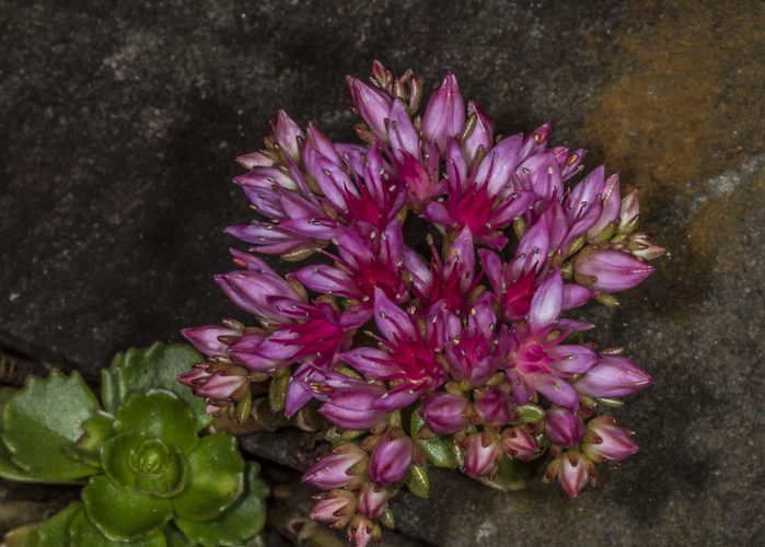 Esta hermosa planta es suculenta con hojas de color verde brillante y racimos de flores en forma de estrella que son de color rosa y rojo. Florece en verano y sus hojas retienen mucha agua, ofreciendo una excelente protección contra incendios a un techo verde. También es una planta de bajo mantenimiento que prospera en suelos pobres y bien drenados.