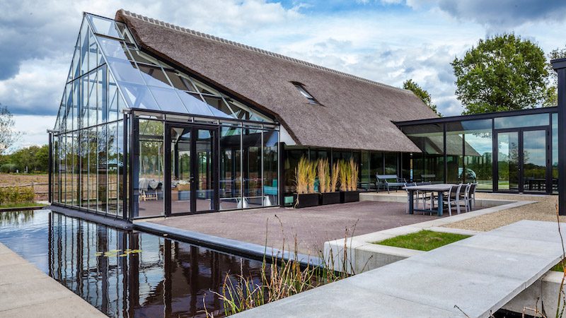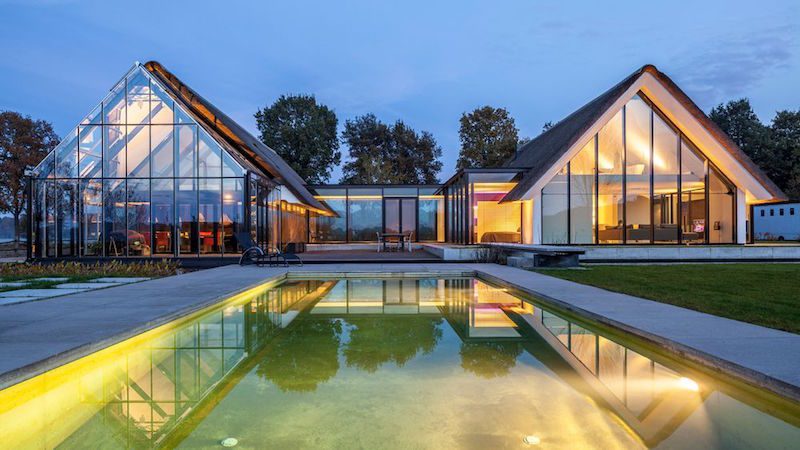 La casa tiene techos de paja , un estilo que ha vuelto con fuerza últimamente, siendo popular en muchos edificios modernos. Pero lo que más destaca en este caso es la parte trasera de la casa. En la parte trasera, el volumen se extiende más allá del techo de paja y toda esta sección se parece mucho a un invernadero. Las paredes y el techo de vidrio envuelven el espacio, haciendo que el interior sea muy luminoso y abierto.