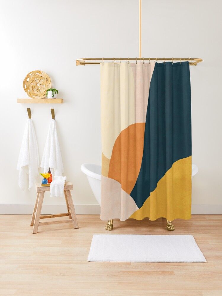 Las cortinas de baño modernas de mediados de siglo como esta son brillantes y agregan un toque de color y diseño a su baño. Las cortinas de baño son uno de los pocos lugares donde puede agregar personalidad al baño. Y es una de las formas más económicas de cambiar totalmente la apariencia del baño.
