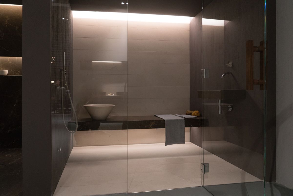 Otro concepto interesante es una ducha a ras de suelo abierta. Este solo tiene un separador entre este y el inodoro. Mantiene un aspecto muy abierto y ventilado en todo el baño.
