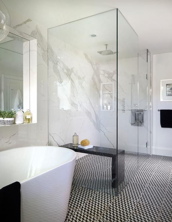 Claro, una ducha a ras de suelo puede ser muy eficiente en espacio si así lo desea, pero también tiene la opción de una ducha grande y espaciosa, como esta. Tiene un banco, iluminación de acento y un diseño sofisticado en general.