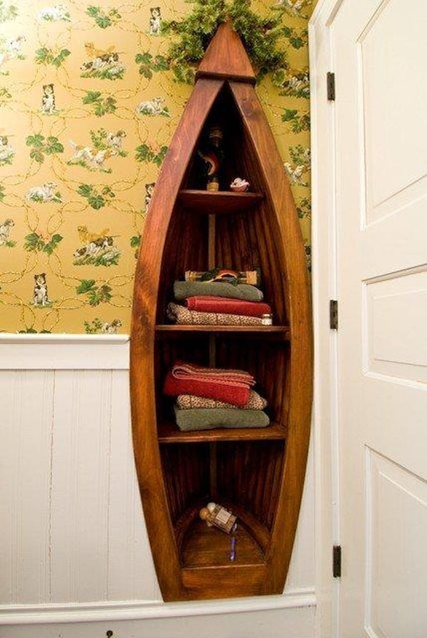 Por ejemplo, podrías transformar la canoa en una especie de espacio de almacenamiento. Agregue algunos estantes a su diseño y podrá usarlo como librero o para almacenamiento en espacios como el garaje.