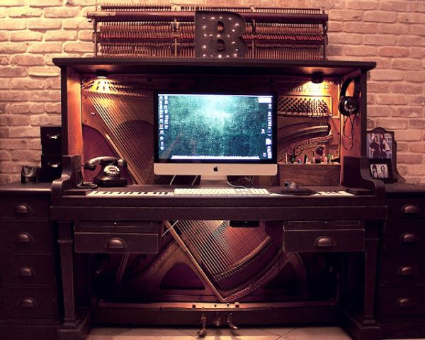 Otra gran idea puede ser convertir un viejo piano en un escritorio para la oficina de tu hogar. La transformación puede ser tan compleja como usted quiera que sea. Puede agregar cajones de almacenamiento y estantes al nuevo escritorio y personalizarlo para que sirva como escritorio para computadora.