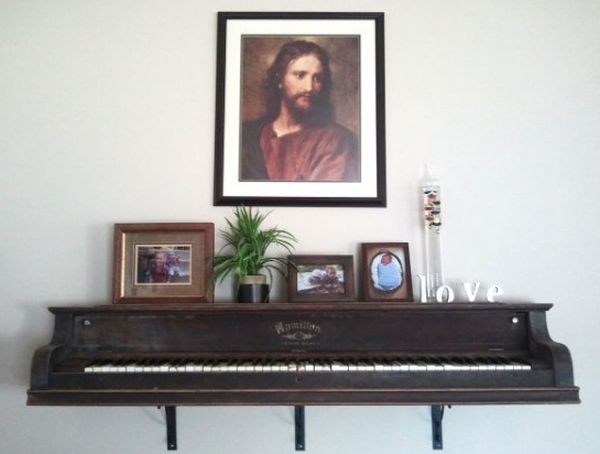Una alternativa, si prefieres algo más pequeño y sencillo, es cortar el piano y utilizar únicamente la pieza frontal. Conviértelo en un estante montado en la pared o incluso en una mesa consola. Podría tener fotos enmarcadas o coleccionables en él.