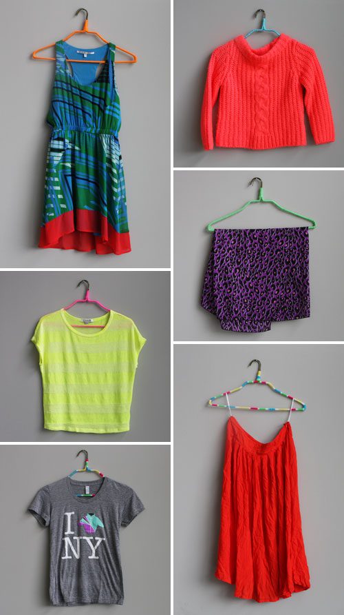Si simplemente prefiere usar las perchas para el propósito para el que fueron diseñadas, tal vez quiera darles al menos un aspecto más colorido. Necesitarás perchas de alambre, hilo, cinta adhesiva y tijeras. Ate el hilo justo debajo de la curva en la parte superior de las perchas y envuélvalo. Asegúrate de que esté apretado. Use cinta para mantenerlo seguro al final. {Encontrado en brit }.