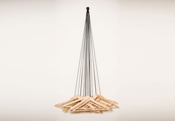 Otra idea interesante sería usar las perchas para el propósito previsto pero de una manera nueva y única. Este, por ejemplo, es un armario hecho con 20 perchas de madera. Están colgando de cuerdas negras y juntos forman una pieza con un atractivo escultórico y un aspecto moderno e inusual. {Encontrado en swiss-miss }.