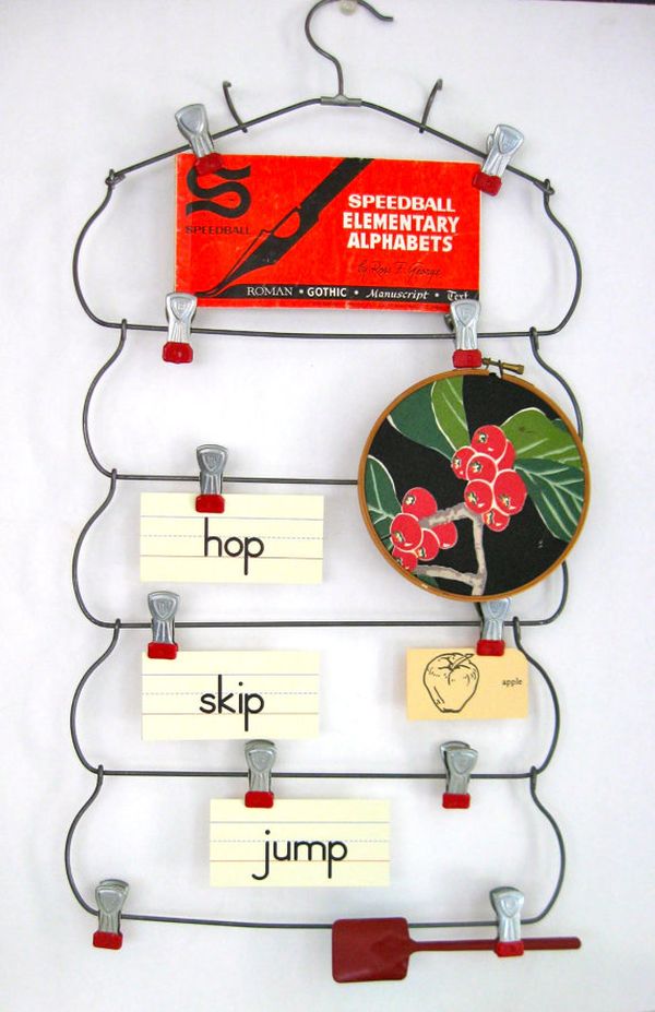 Esto solía ser una percha de falda vintage, pero ahora es una tabla inspiradora. Puedes hacer algo similar. Necesitas una percha y algunos clips retro. Es genial para mostrar todo tipo de cosas como tarjetas, fotos, memos o notas. Es algo que puedes hacer para ti o como regalo para alguien. Es divertido y fácil. {Encontrado en etsy }.