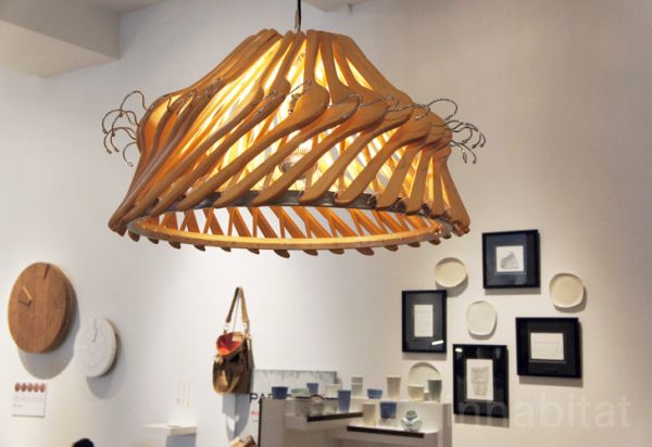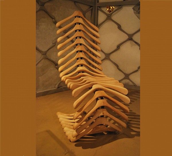 Los colgadores también se pueden reutilizar y utilizar para proyectos más complejos. Esta, por ejemplo, es una silla muy interesante hecha con perchas de madera reutilizadas. Tiene un aspecto muy escultural e intrigante y definitivamente es una pieza llamativa que sería un punto focal espectacular en cualquier espacio. {Encontrado en el sitio }.