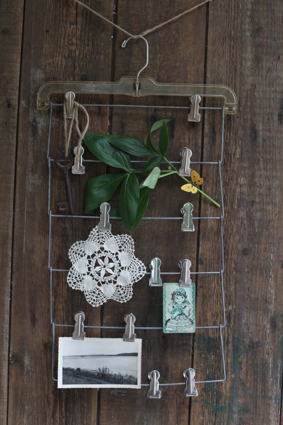 Aquí hay una idea similar: use una percha vieja para hacer una hermosa exhibición en la pared. Necesitarás muchos clips y una percha bonita. Puede mostrar fotos y todo tipo de pequeños tesoros que son agradables a la vista. Solo encuentra un lugar para él y disfruta de tu nueva decoración. No lleva más de unos minutos hacerlo y también puede mejorar el diseño si lo desea. {Encontrado en etsy }.