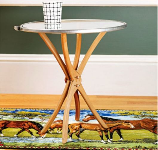 También puedes ser un poco más astuto y hacer una mesa de café con perchas de madera. Las perchas deben tener todas las mismas dimensiones y diseño. Necesitará cuatro perchas, alicates, un taladro, un cortador de pernos y una pieza redonda de vidrio que servirá como parte superior. Retira los ganchos de las perchas y luego junta las perchas, creando la base de la mesa de café. Use abrazaderas para mantenerlos seguros. Taladre los agujeros y deslice los tacos a través de ellos y córtelos. Retire las abrazaderas y agregue la tapa de vidrio. {Encontrado en el sitio }.