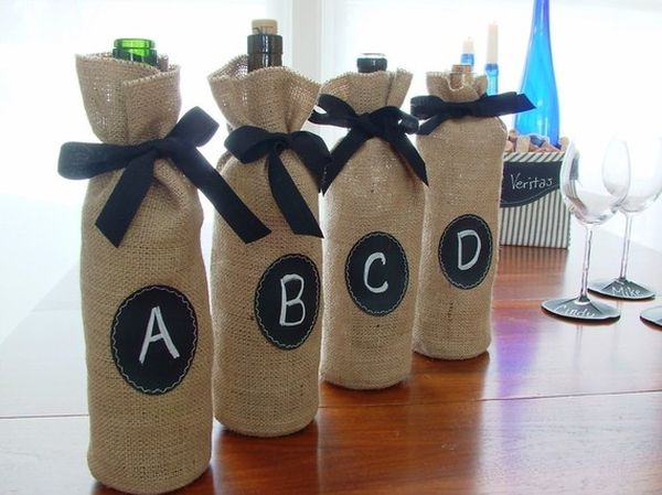 Si no quieres perder el tiempo personalizando cada botella de vino, puedes hacer bolsas de arpillera para todas ellas. Envuelve la botella en ellos y haz un bonito lazo. También puede poner etiquetas de pizarra en cada uno. {Encontrado en etsy }.