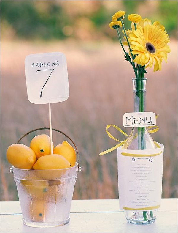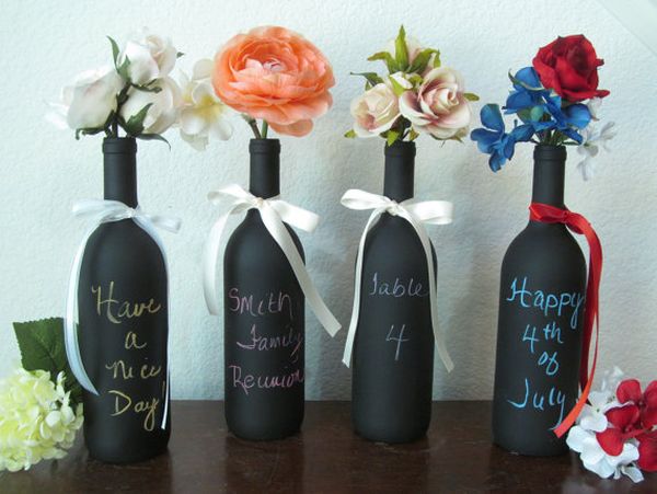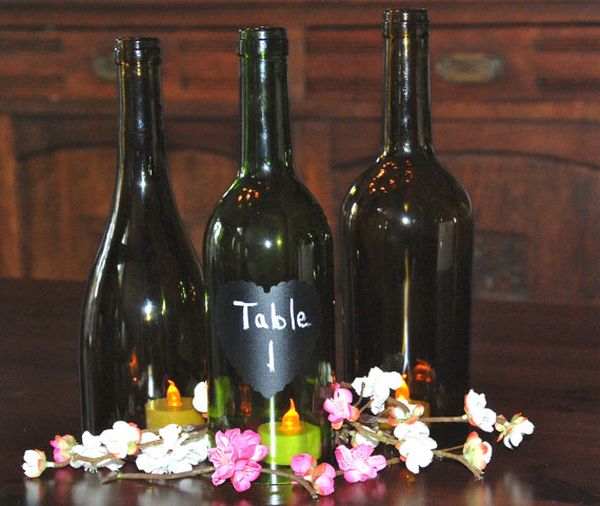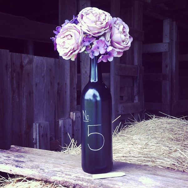 También sería fácil de hacer este jarrón de botella de vino de pizarra. Debe pintar la botella con pintura en aerosol, ponerle algunas flores y escribir los números de la mesa en la botella. Es hermoso y práctico al mismo tiempo.