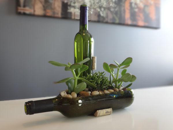 Con un poco de paciencia y atención, también puedes hacer impresionantes mini jardines de botellas de vino para las mesas. La botella necesita ser cortada con gran estuche y colocada horizontalmente. Los tipos de plantas y suculentas que uses dependen totalmente de ti. {Encontrado en etsy }.