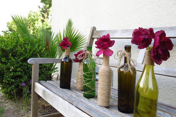 Para una fiesta o evento al aire libre también puedes usar botellas de vino como jarrones para la cerca. Átelos con cordel, coloque una rosa dentro y decore las paredes y cercas con ellos.