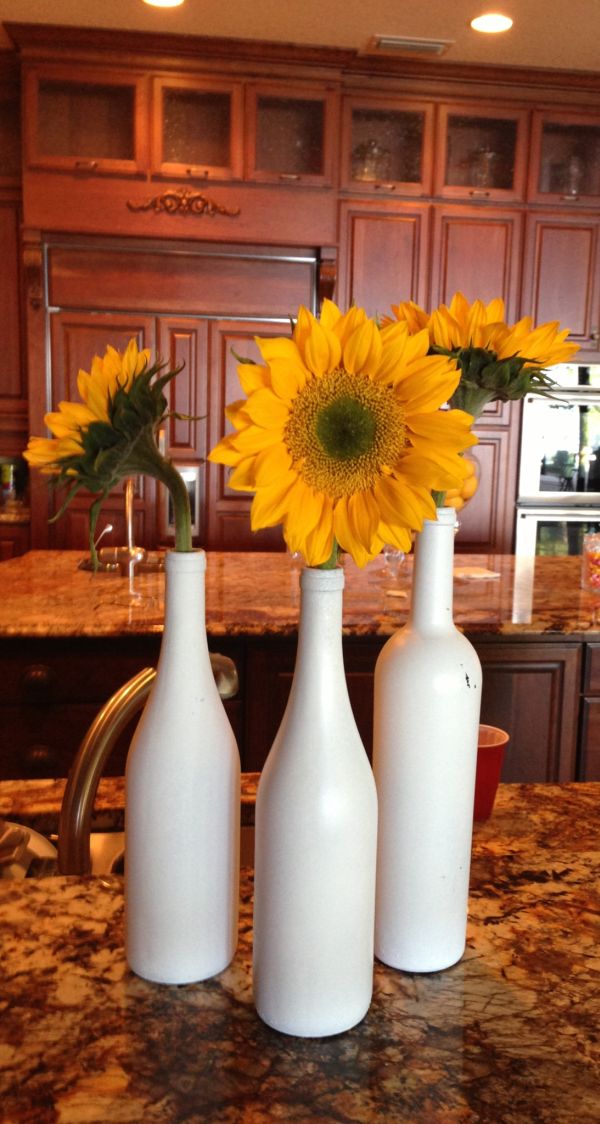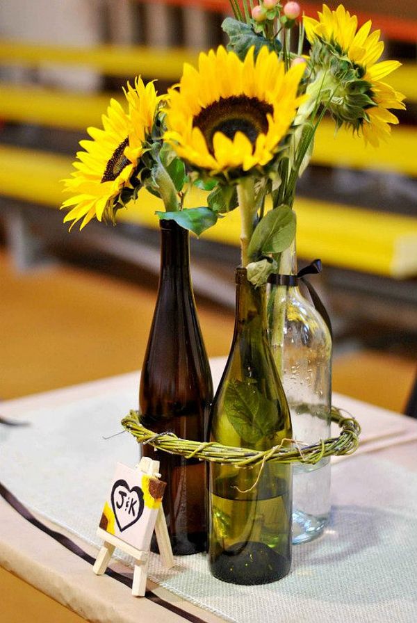 Este es un conjunto de tres jarrones de botellas de vino y tienen una corona de sauce alrededor de ellos, ese es el detalle que necesitan para sobresalir. Las flores le dan un toque rústico muy bonito a todo el arreglo. Como notará, las botellas de vino se ven mejor en pares. {Encontrado en etsy }.