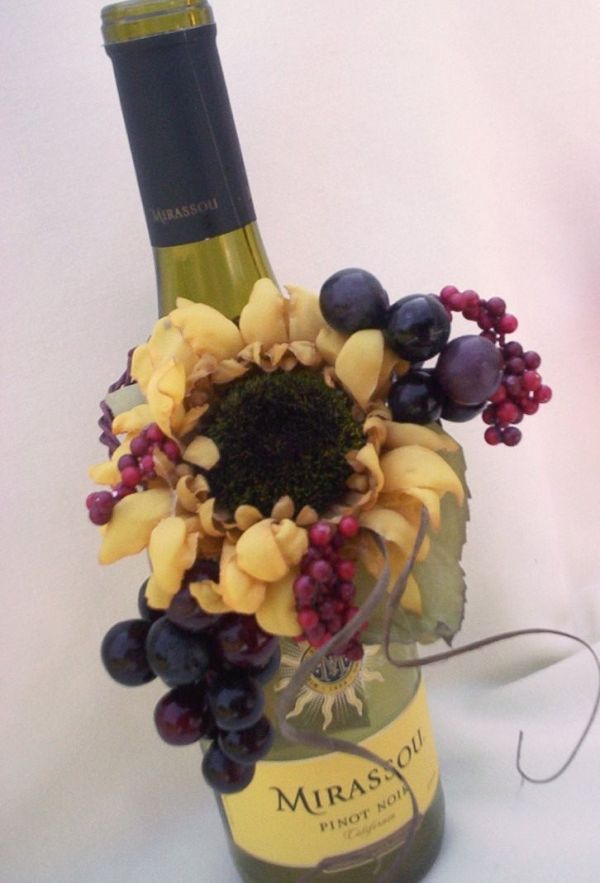 Este es un jarrón más inusual. Las flores y todo lo demás que normalmente se muestra dentro del jarrón ahora está atado alrededor de la botella. De esta manera, incluso puedes usar botellas de vino reales con vino en ellas.
