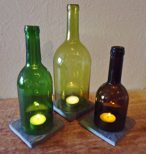 Para una decoración de mesa más romántica, también puedes hacer candelabros para botellas de vino. Recorta la parte superior de la botella a diferentes alturas y combínalas de diferentes maneras. Es una idea ingeniosa para una boda. {Encontrado en etsy }.