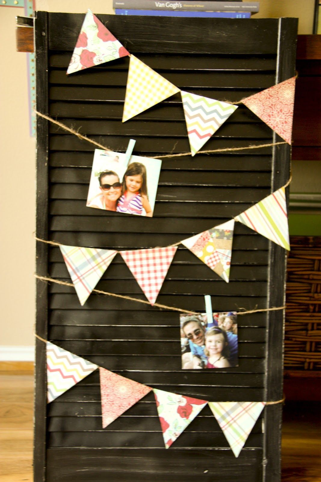 Obturador manchado decorado con banderines y fotografías.