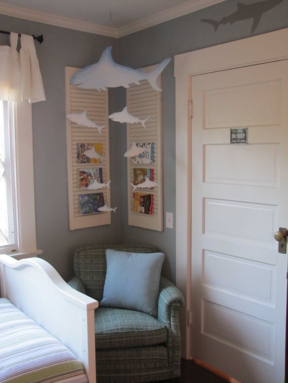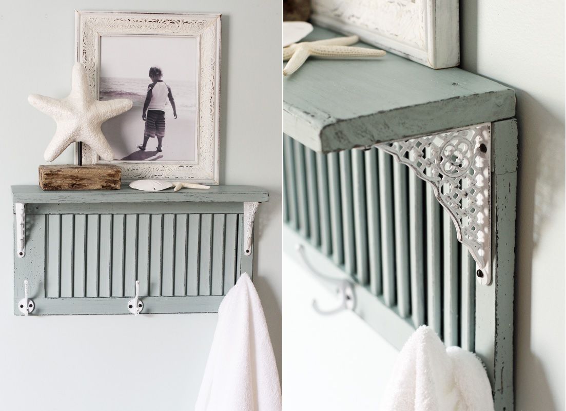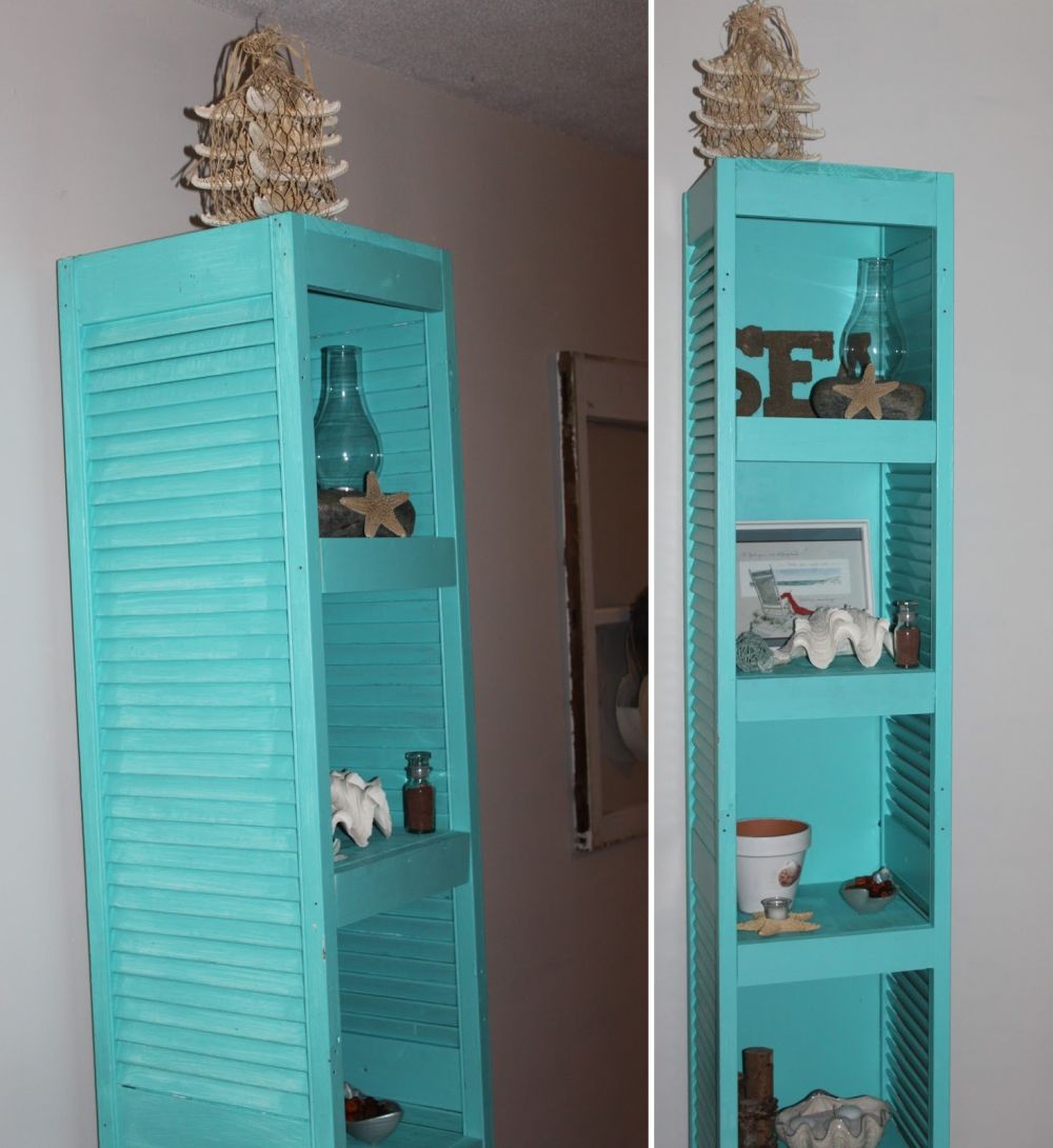 Hay más de un tipo de contraventanas y cada uno se puede utilizar en varios tipos de proyectos. Los largos y angostos, por ejemplo, son geniales para construir cosas como cabeceras o, como Purehunnybee , estanterías. Use dos contraventanas para hacer una unidad y considere una decoración temática costera para ella.