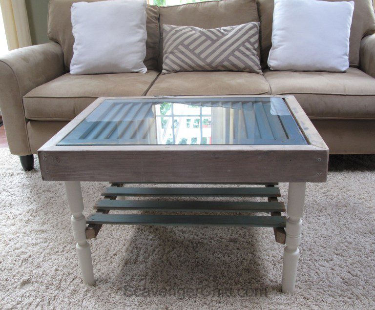 Esta mesa está hecha íntegramente con materiales reciclados y entre ellos también hay una contraventana de madera. Se utilizó un poco de madera de desecho para construir el marco de la mesa y se tuvo que cortar el postigo a la medida. Se remató con vidrio y se agregaron cuatro patas de un mueble antiguo para completar el diseño. {Encontrado en Scavengerchic }.