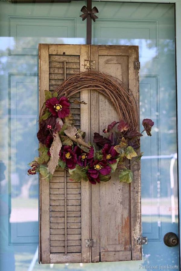 Hay todo tipo de usos geniales para las persianas viejas como decoración. Incluso se pueden usar como adiciones a adornos clásicos como coronas. Echa un vistazo a esta hermosa corona de otoño con su marco de persiana de madera. Es un poco como el inicio de una puerta cuando lo ves desde la distancia. Puede encontrar más detalles al respecto en petticoatjunktion.