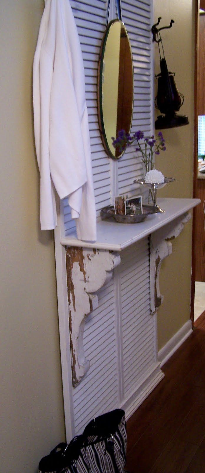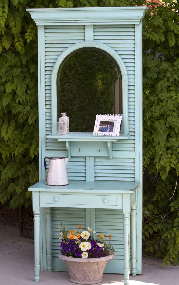 Ahora que tiene una idea de cómo se pueden reutilizar y transformar las contraventanas viejas, tal vez le gustaría probar algo un poco más complejo, como este hermoso tocador/árbol de vestíbulo que aparece en Lifeatthecottage . Las contraventanas en este caso proceden de puertas de armario y se han combinado con un pequeño escritorio.