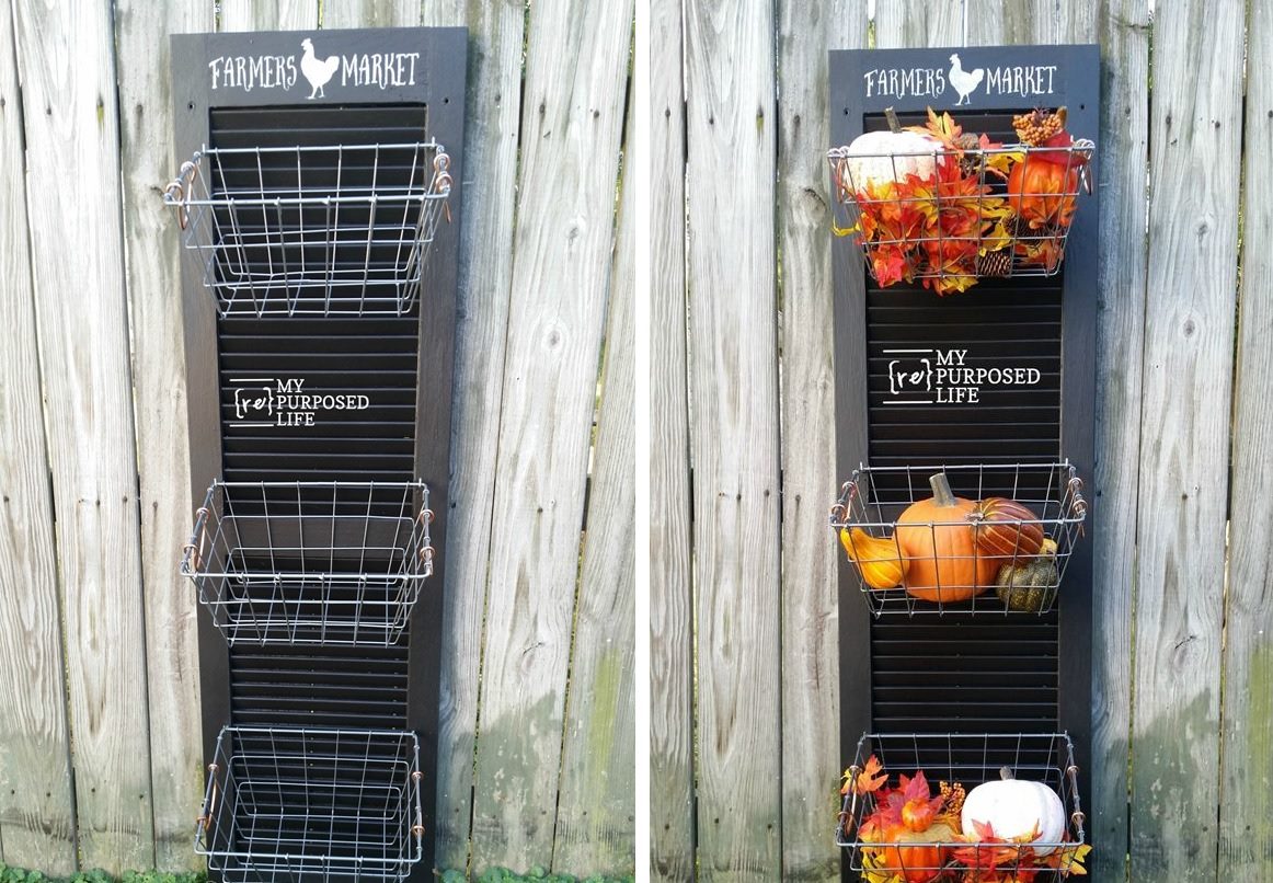 Una contraventana vieja se puede reutilizar de muchas maneras útiles y una de las ideas se describe en myrepurposedlife . Aquí puede descubrir cómo transformar una persiana en un sistema de contenedor de productos colgantes con mucho encanto del mercado de agricultores.