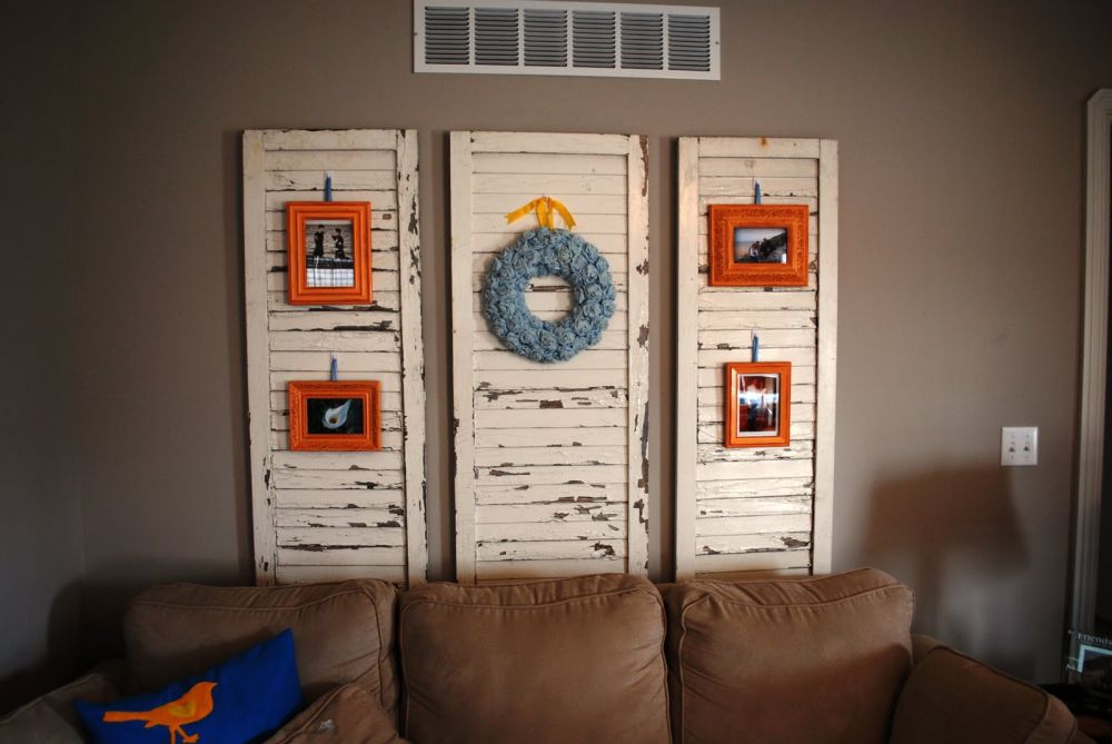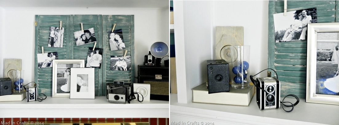 Hay más de una forma de exhibir un portafotos, incluso si está hecho de una contraventana reutilizada. Si tiene una chimenea, por ejemplo, puede mantener la persiana en la repisa de la chimenea. Los jarrones, las fotos enmarcadas y otras decoraciones también se pueden guardar en la repisa de la chimenea. {encontrado en madincrafts }