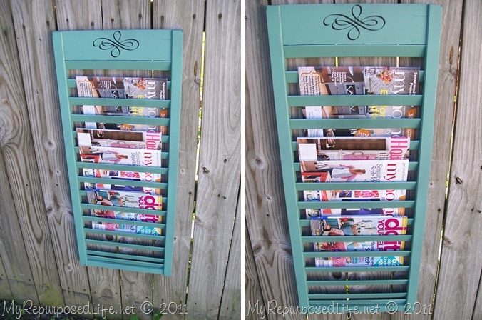 Una contraventana de madera reutilizada puede contener revistas pero también libros. Dado que los libros suelen ser bastante pequeños, es posible que no necesite quitar los listones de la contraventana, lo que significa que la transformación es mucho más fácil y rápida. Simplemente pinte el obturador y encuentre un buen lugar para colocarlo en una pared. Tal vez a los niños les vendría bien algo así en sus habitaciones. {Encontrado en bellezas caseras por heidi }.