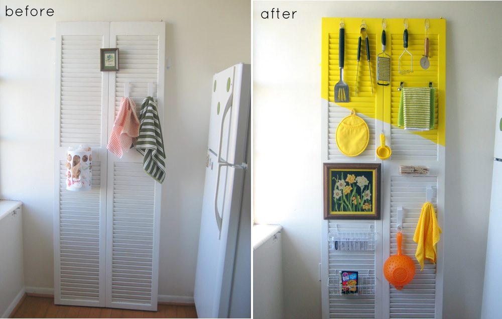 Una nueva capa de pintura realmente puede cambiar una persiana vieja, por lo que este sería un excelente punto de partida si desea reutilizar y revivir una. Píntalo de blanco si no quieres que resalte mucho. En designsponge puede ver cómo un proyecto de este tipo puede terminar en una cocina donde la contraventana puede servir como un organizador informal.