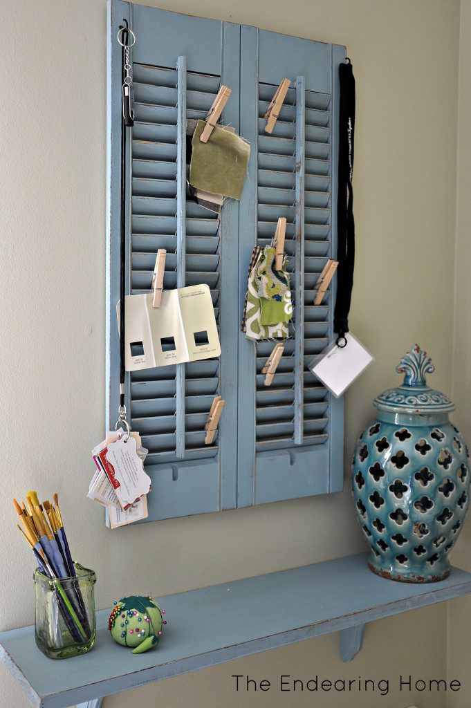 Tal vez a su oficina también le vendría bien el toque cálido y encantador de una persiana vieja reutilizada. Podrías convertir uno en una estación de organización . Limpiarlo, pintarlo y montarlo en la pared. Luego agregue un estante separado justo debajo de él. Es algo que aprendimos de Theendearinghome .