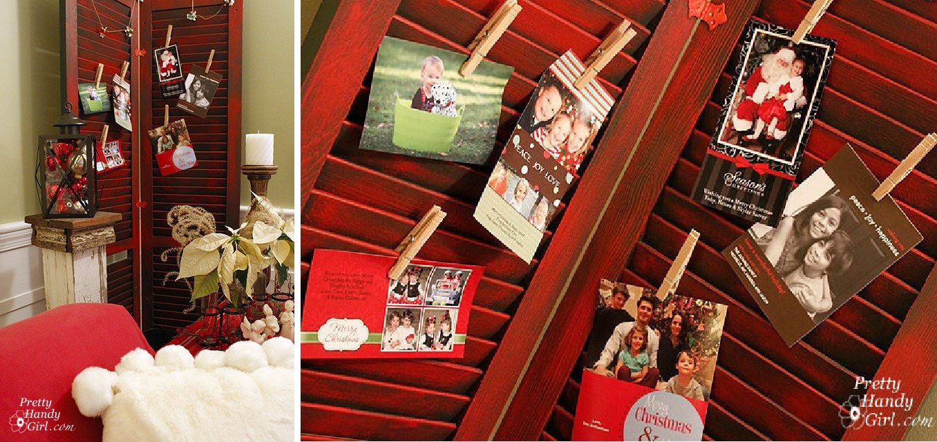 Una idea sugerida en Prettyhandygirl es que una contraventana de madera se puede transformar en un tablero de exhibición para tarjetas de Navidad . Si bien eso parece práctico y bonito, en realidad estamos más fascinados por el trabajo de punto en esta cosa. El secreto es pasar la pintura a pincel seco sobre las persianas, saltándose las lamas.