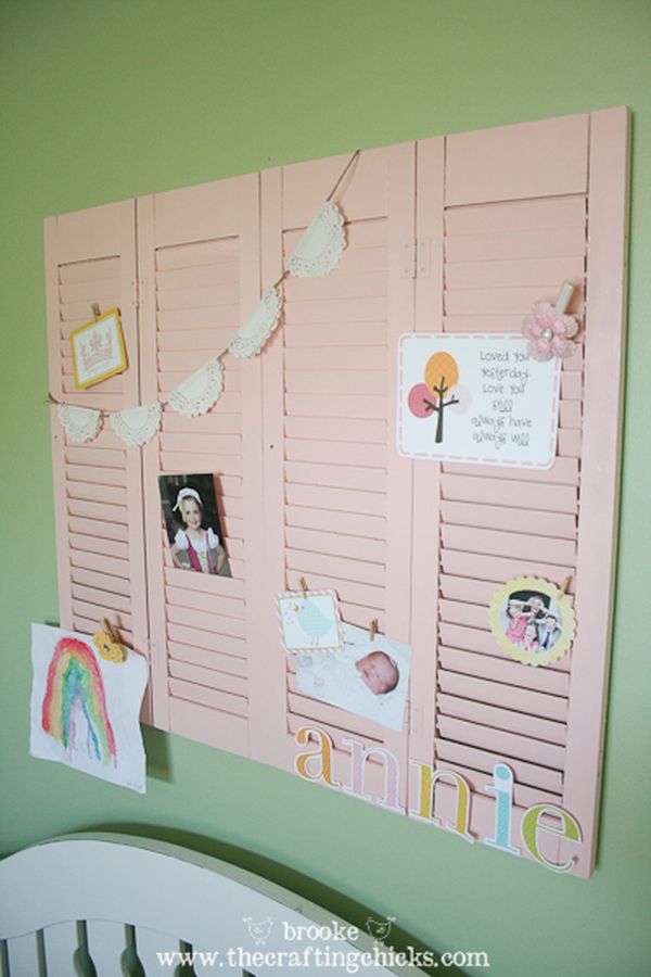 Como probablemente ya se haya dado cuenta, puede integrar la persiana en cualquier habitación de la casa, ya sea como decoración o como accesorio útil. Aquí hay algo adorable que puedes hacer para la habitación del bebé. Es una exhibición de pared hecha con pequeñas persianas de madera y algunos adornos lindos, como un mini banner hecho con tapetes de papel y algunas imágenes. Echa un vistazo a thecraftingchicks si estás interesado en el tutorial.