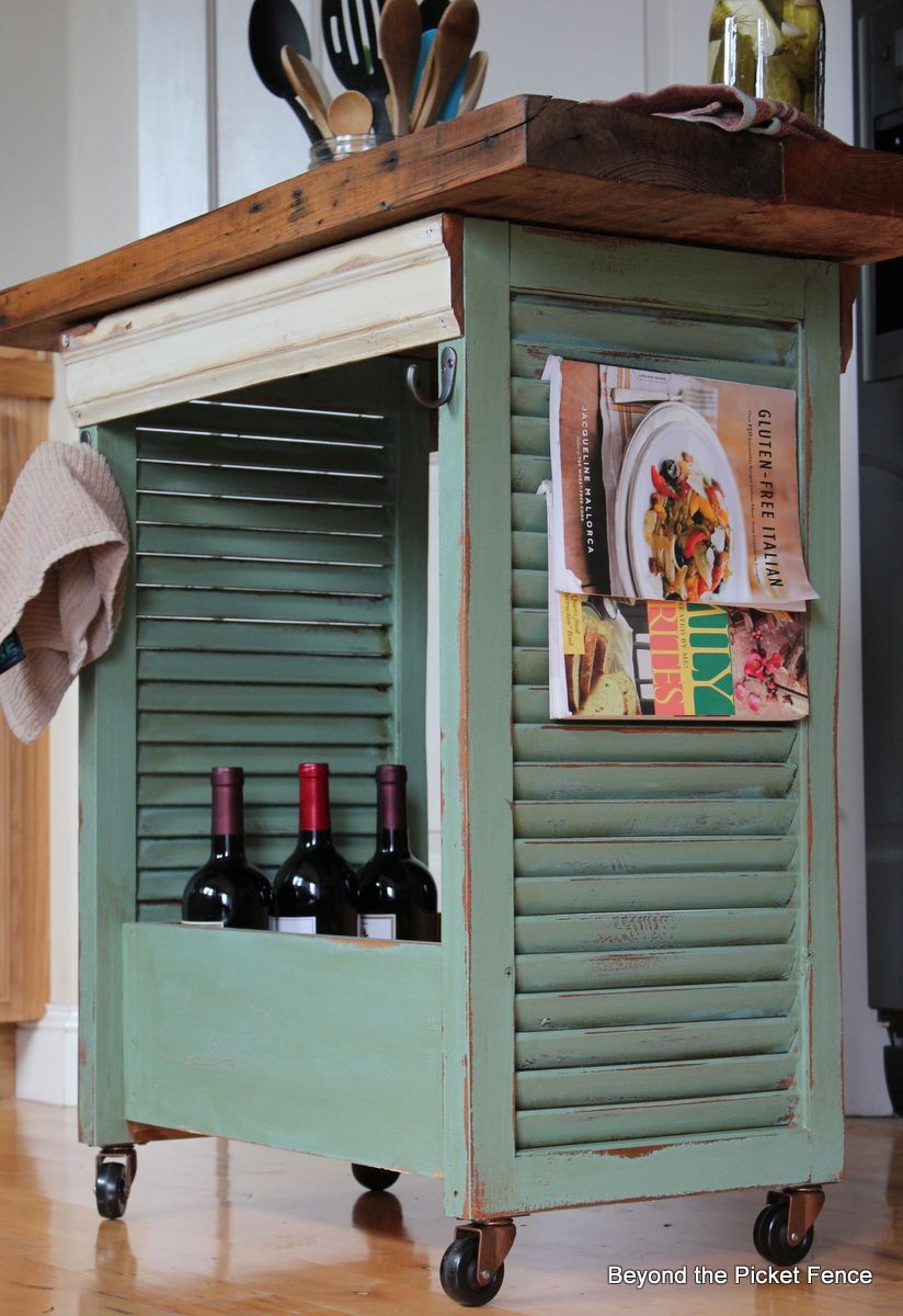 Un par de contraventanas y un cajón desechado pueden ser muy útiles. Puedes usar estas cosas para hacer una pequeña isla de cocina como la que se muestra en Beyondthepicket . Instale ruedas para que pueda moverlo según sea necesario y pinte las persianas y el cajón si desea darles un aspecto fresco que combine con el resto de la decoración.