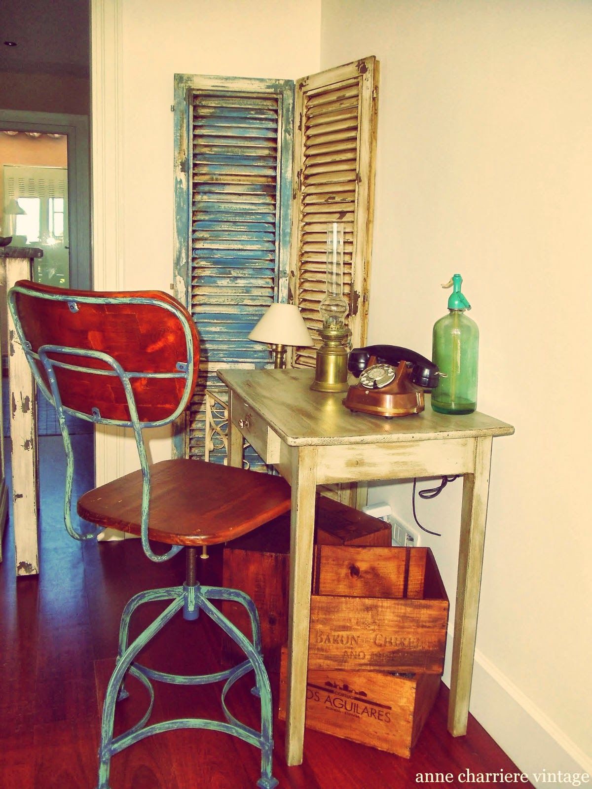 Del mismo modo, las persianas que se muestran en Aglimpseinsideblog actúan como telón de fondo para las fotos enmarcadas y las demás decoraciones que contienen. En este caso, sin embargo, las persianas no se repintaron sino que en realidad solo se limpiaron y conservaron tal como estaban.