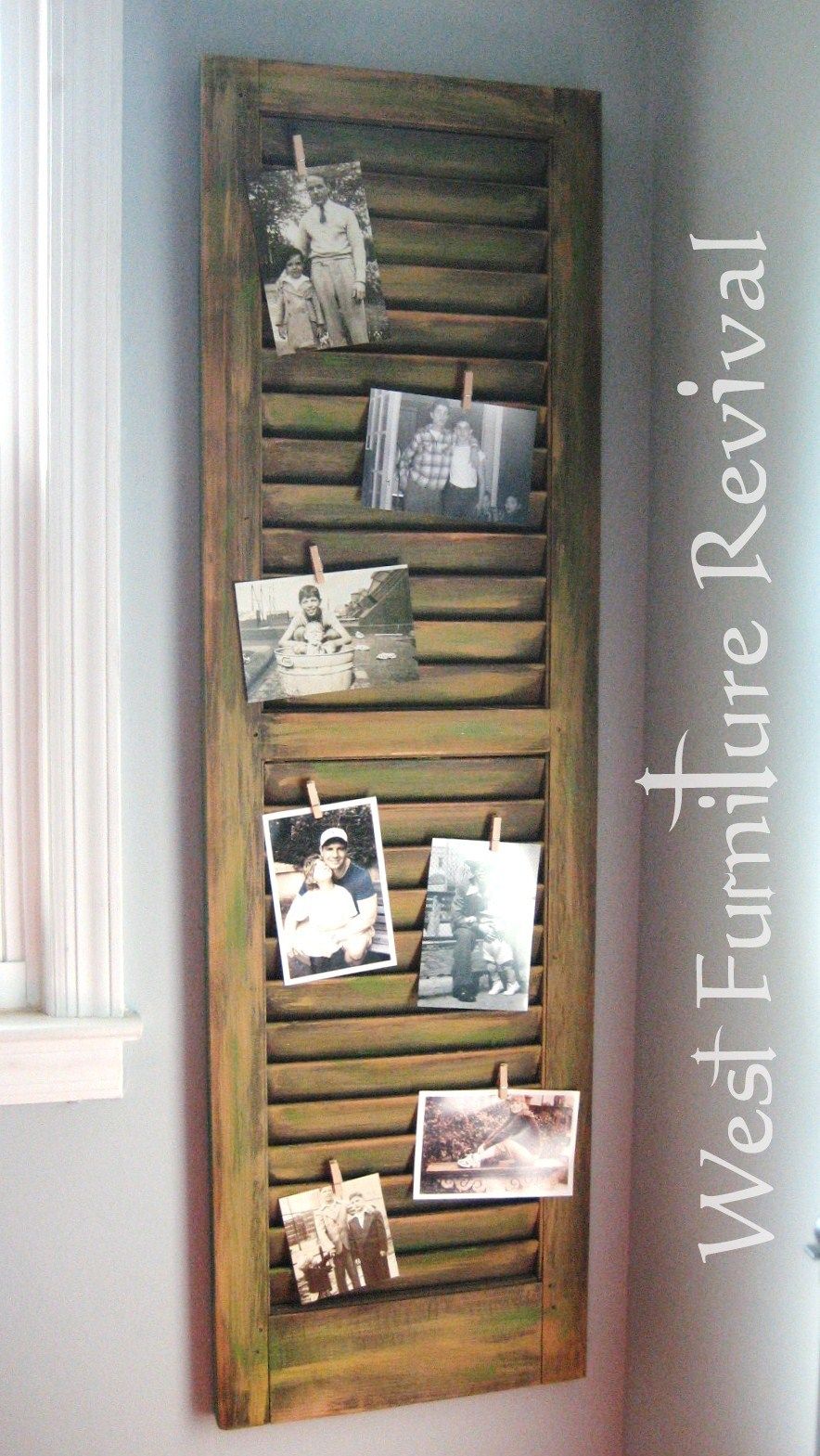 Incluso si no tiene sus propias persianas de madera que pueda reutilizar, probablemente pueda comprar un par viejo por un precio muy bajo. Es posible que no haya necesidad de cortar el obturador ni de realizar grandes modificaciones estructurales. Si desea reutilizar la persiana de una ventana para convertirla en una pieza de exhibición de fotografías , puede simplemente limpiarla y teñirla o, si desea conservar su carácter, dejarla como está. Colóquelo en una pared o apóyelo contra una y adjunte las fotos con mini pinzas para la ropa. {Encontrado en westfurniturerevival }.