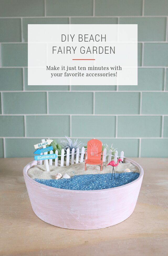 También puedes darle una historia a tu mini jardín. Por ejemplo, este es un jardín de hadas inspirado en la playa y tiene arena fina, gránulos de vidrio azul que simbolizan el agua y un montón de pequeños accesorios como una valla, una tumbona, un letrero de playa y también algunas plantas escondidas detrás. la cerca. Es un diseño encantador y si está interesado en conocer más detalles sobre él y cómo se hizo este jardín de hadas, puede dirigirse a camaronessaladcircus .