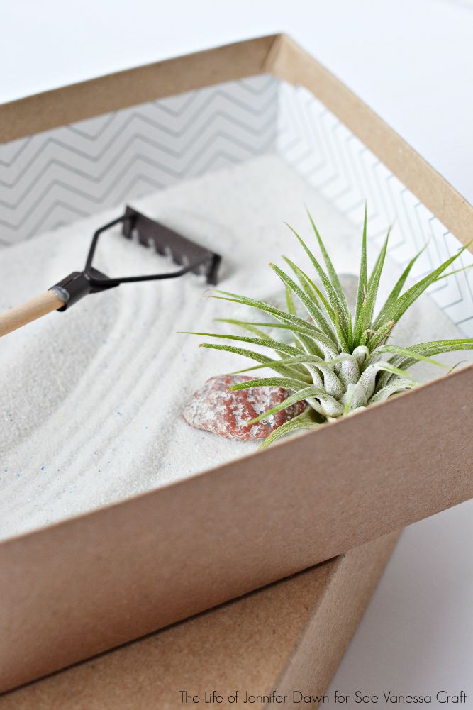 Los jardines zen no necesitan ser súper elegantes. De hecho, es la simplicidad y la pureza lo que los hace tan hermosos e inspiradores en primer lugar. Con eso en mente, busque cualquier suministro que pueda usar, como una caja pequeña, un poco de arena y algunas rocas pequeñas y tal vez también una planta de aire. Cualquier caja de cartón se vería y siempre puede actualizar a otra cosa más adelante a medida que tenga más ideas. Puede convertir esto en un pequeño kit que puede ofrecer como regalo. La idea viene de seevanessacraft .