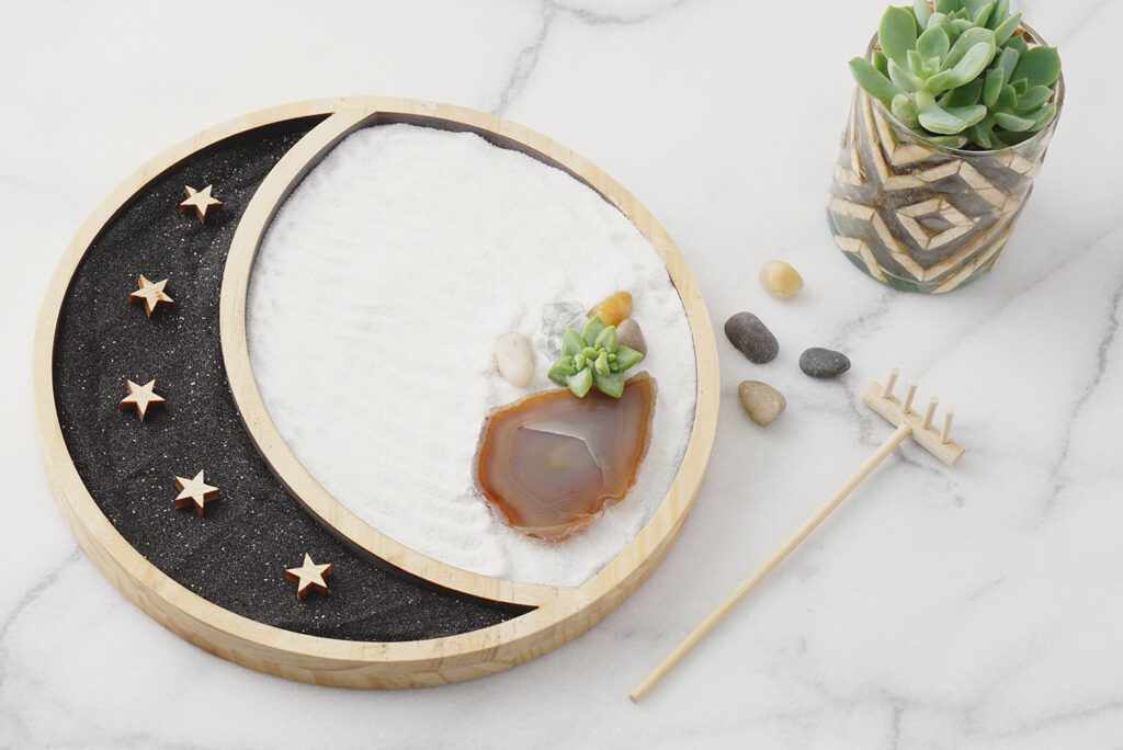 Hay kits que puedes comprar y que incluyen algunos elementos esenciales para hacer un mini jardín zen, pero también puedes improvisar y reunir todo tú mismo. Puedes utilizar cualquier bol o bandeja poco profunda de madera, cristal, metal o el material que prefieras. La parte más importante es la arena fina con la que llenas el recipiente. Una vez que la arena esté en su lugar, puede agregar cosas como pequeñas rocas, conchas marinas, cuentas y pequeñas plantas o figuritas para crear una escena. Se pueden encontrar más detalles e ideas inspiradoras en confesionsofanover-workedmom .