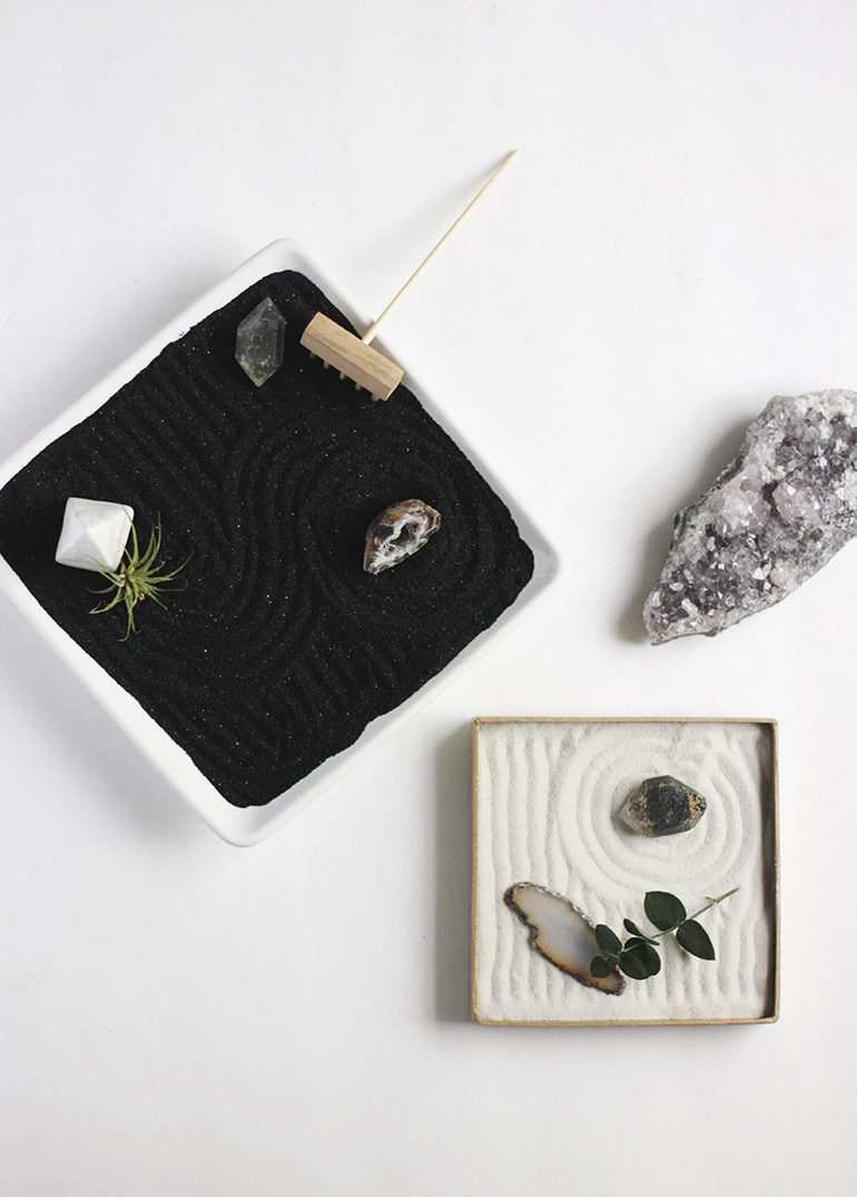 Un mini jardín zen también puede ser súper simple. No necesita un montón de figuritas para que se vea hermoso y tampoco necesita necesariamente ningún suministro especial. Para el contenedor, puede usar cualquier plato poco profundo y puede llenarlo con arena y algunas chucherías, como una o dos plantas de aire, algunas piedritas pequeñas y, potencialmente, un mini rastrillo para que pueda jugar con la arena cuando lo desee. relajarse y encontrar paz y tranquilidad. Aquí puedes ver dos versiones, una con arena blanca y otra con arena negra y ambas se ven preciosas. Echa un vistazo a therrythought para obtener más detalles.