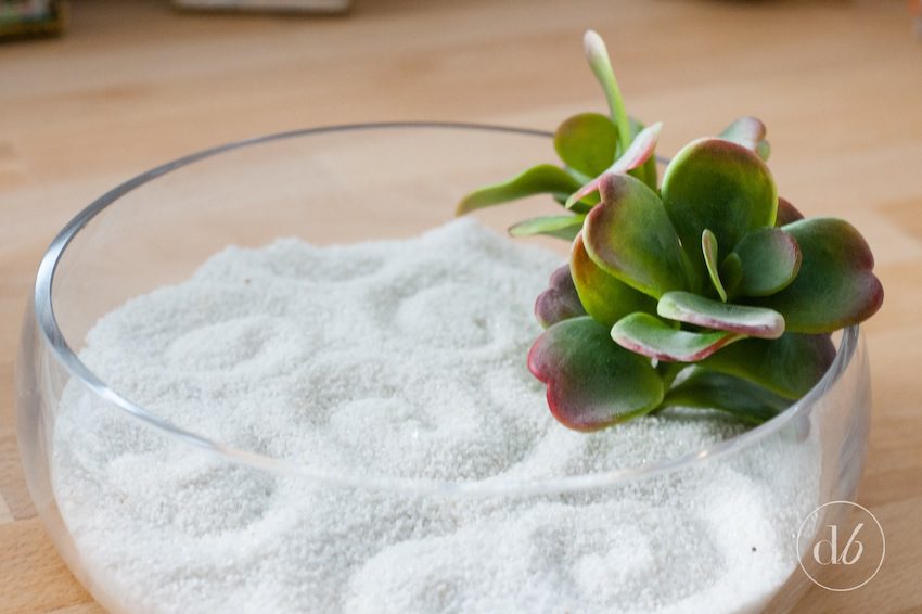 Si le preocupan las plantas y tiene que cuidarlas, considere usar suculentas artificiales en su pequeño jardín zen. Son libres de mantenimiento y algunos realmente se ven súper realistas. Simplemente puede seguir adelante y llenar un recipiente de vidrio o un recipiente con arena, agregar las plantas y llamarlo un día. En lugar de un rastrillo especial en miniatura, puedes usar un lápiz para dibujar en la arena cuando estés aburrido o estresado. Echa un vistazo a habitatbeautiful para obtener más detalles e ideas.