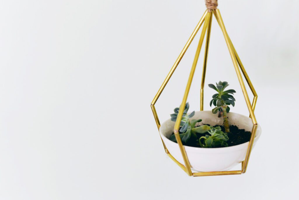 Otra linda idea es colgar plantas de aire que no requieran tierra ni macetas. Puede ser súper creativo con el diseño de las macetas de aire y una opción divertida es usar varillas de latón para crear varios diseños geométricos.