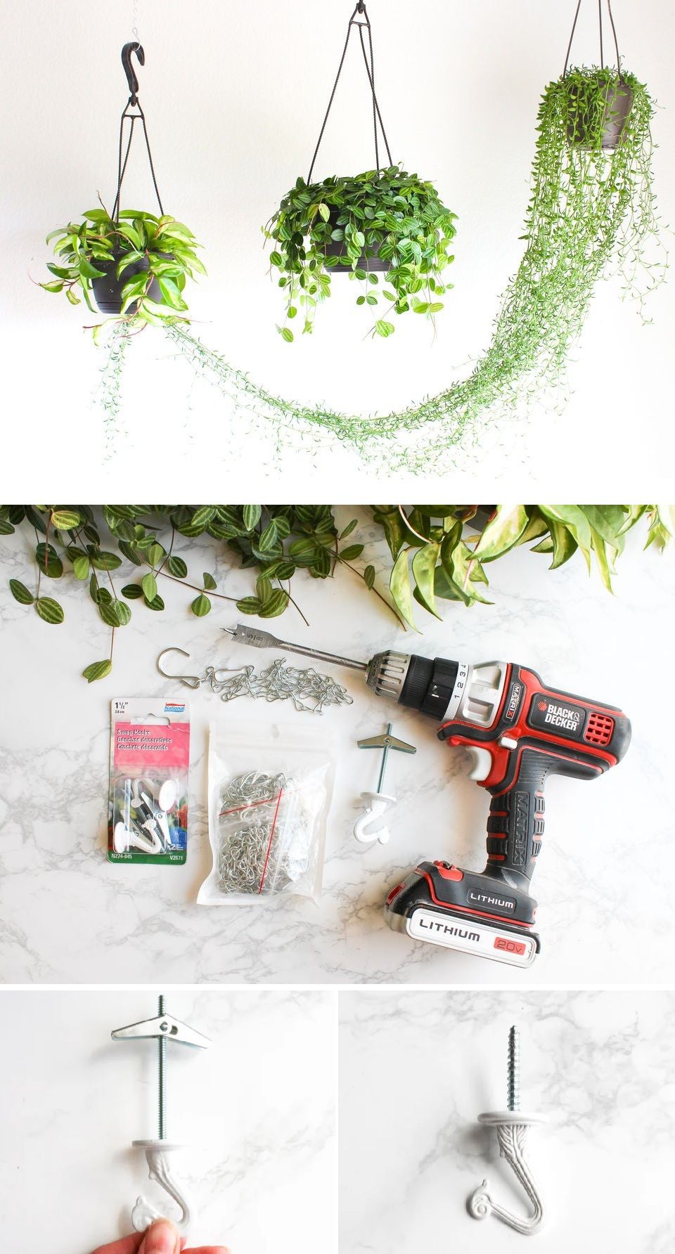 Así es como se hace: Primero, reúnes los suministros. Esto incluye un taladro, una broca de 5/8”, cadenas colgantes ajustables y ganchos colgantes de techo para plantas , uno para cada maceta que desee colgar.